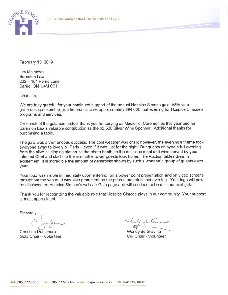 On behalf of the gala committee; Thank you for serving as Master of Ceremonies this year and for Barriston Law’s valuable contribution as the $2,500 Silver Wine Sponsor. Additional thanks for purchasing a table.