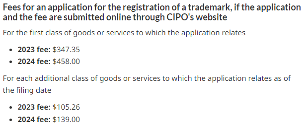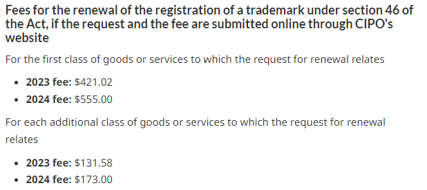 In addition, the Fees for the renewal of a Trademark will also increase effective January 1, 2024 and are as follows:[4]